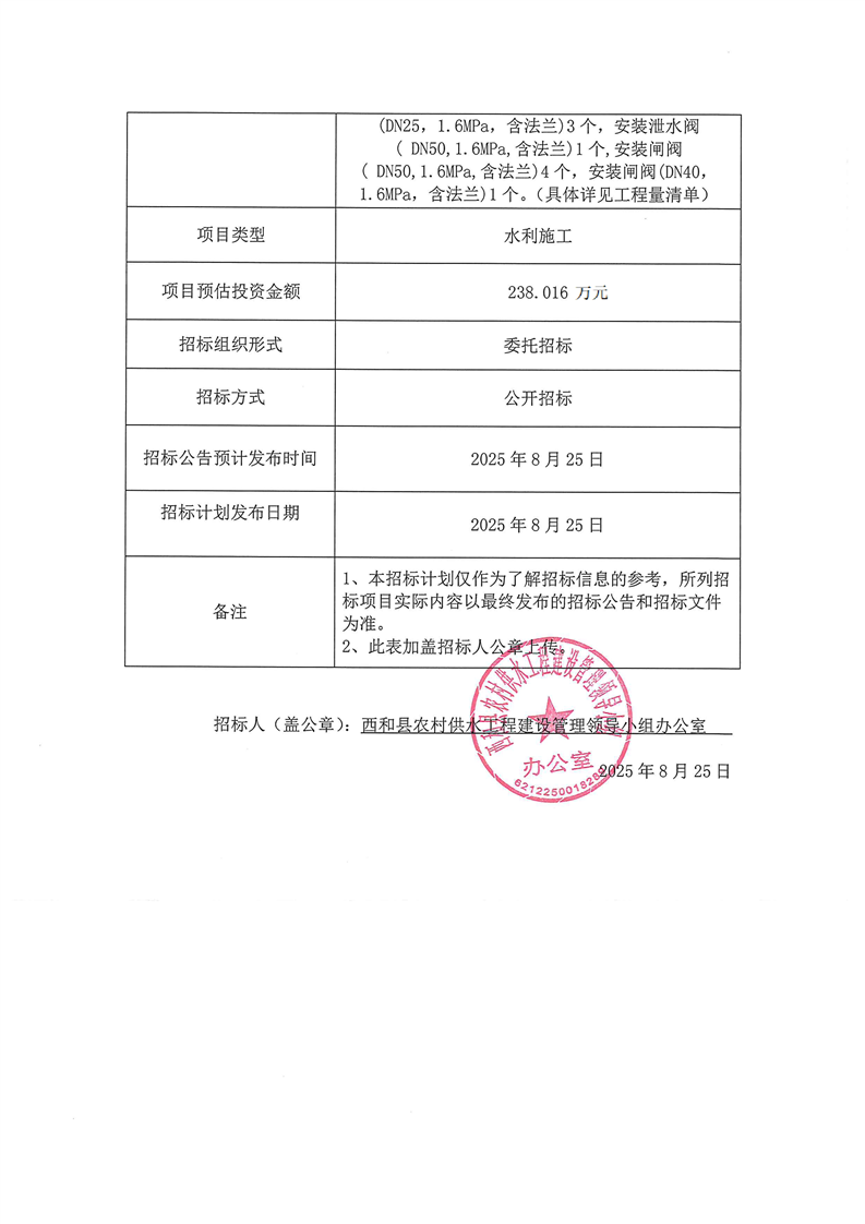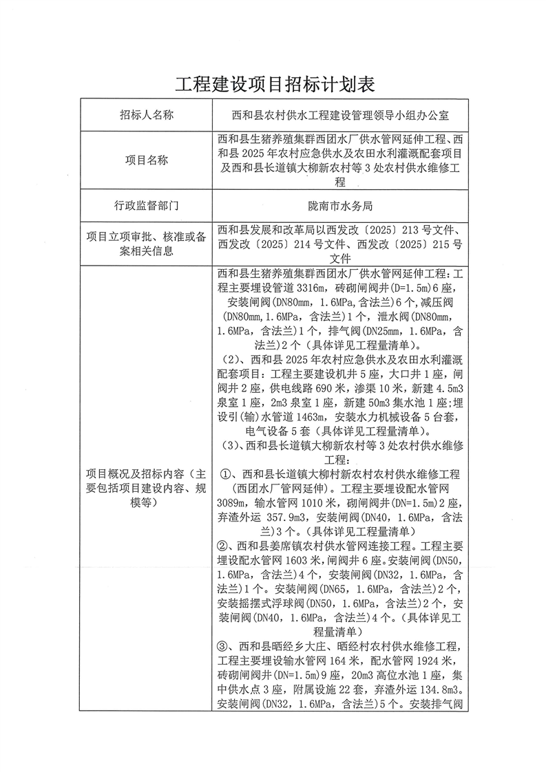 西和縣生豬養(yǎng)殖集群西團(tuán)水廠供水管網(wǎng)延伸工程、 西和縣2025年農(nóng)村應(yīng)急供水及農(nóng)田水利灌溉配套項(xiàng)目及西和縣長(zhǎng)道鎮(zhèn)大柳新農(nóng)村等3處農(nóng)村供水維修工程