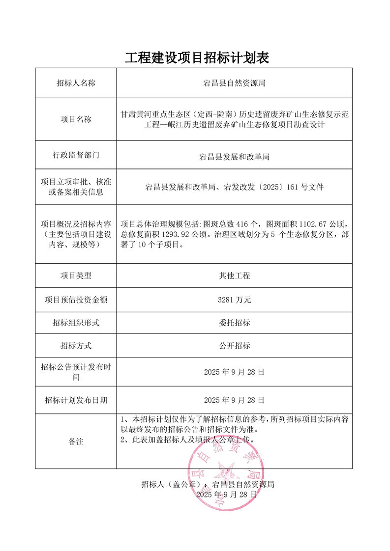 附件:工程建設項目招標計劃表甘肅黃河重點生態(tài)區(qū)(定西-隴南)歷史遺留廢棄礦山生態(tài)修復示范工程—岷江歷史遺留廢棄礦山生態(tài)修復項目勘查設計.pdf