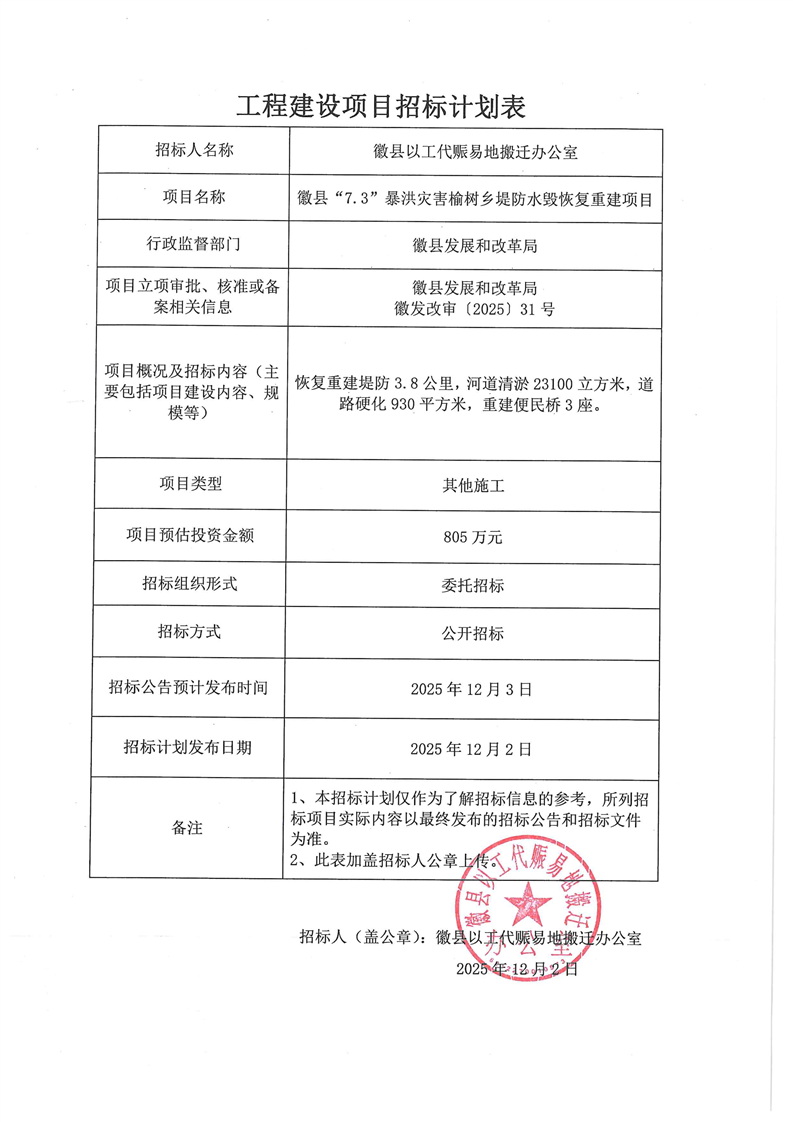 徽縣“7.3”暴洪災害榆樹鄉(xiāng)堤防水毀恢復重建項目