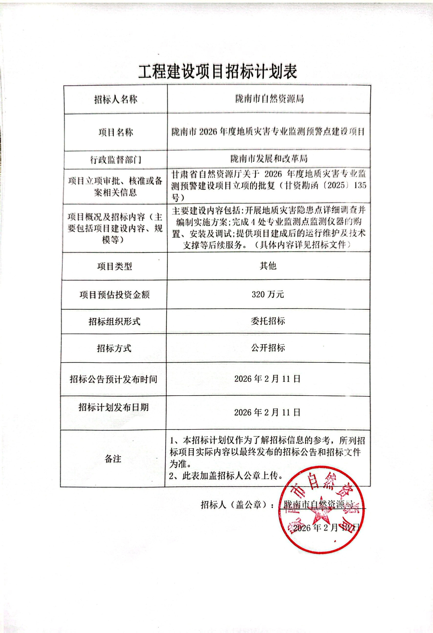 隴南市2026年度地質(zhì)災(zāi)害專業(yè)監(jiān)測預(yù)警點建設(shè)項目