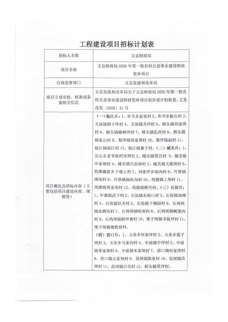 文縣財政局2026年第一批農(nóng)村公益事業(yè)建設(shè)財政獎補項目