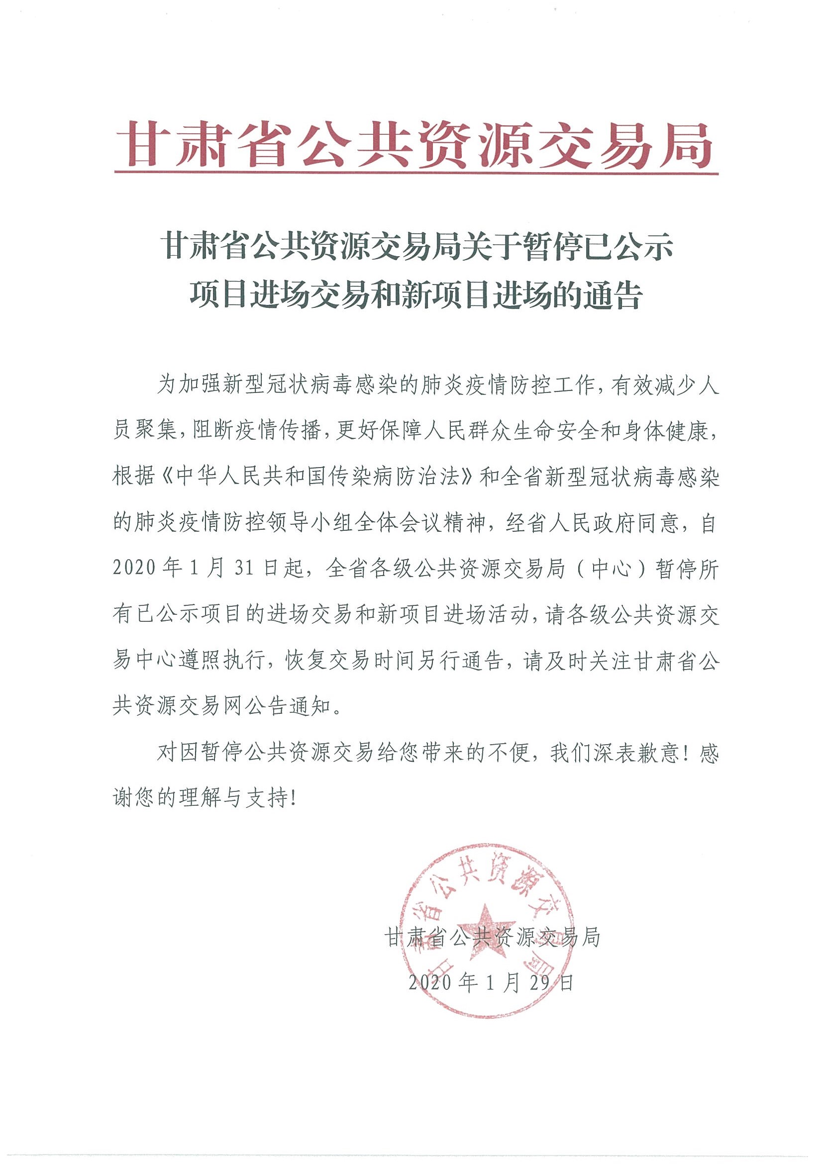 甘肅省公共資源交易局關(guān)于暫停已公示項(xiàng)目進(jìn)場(chǎng)交易和新項(xiàng)目進(jìn)場(chǎng)的通告