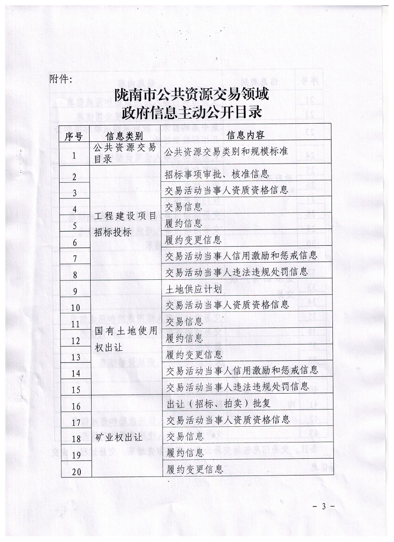 隴南市公共資源交易管理委員會辦公室關于印發(fā)隴南市公共資源交易領域政府信息主動公開目錄的通知