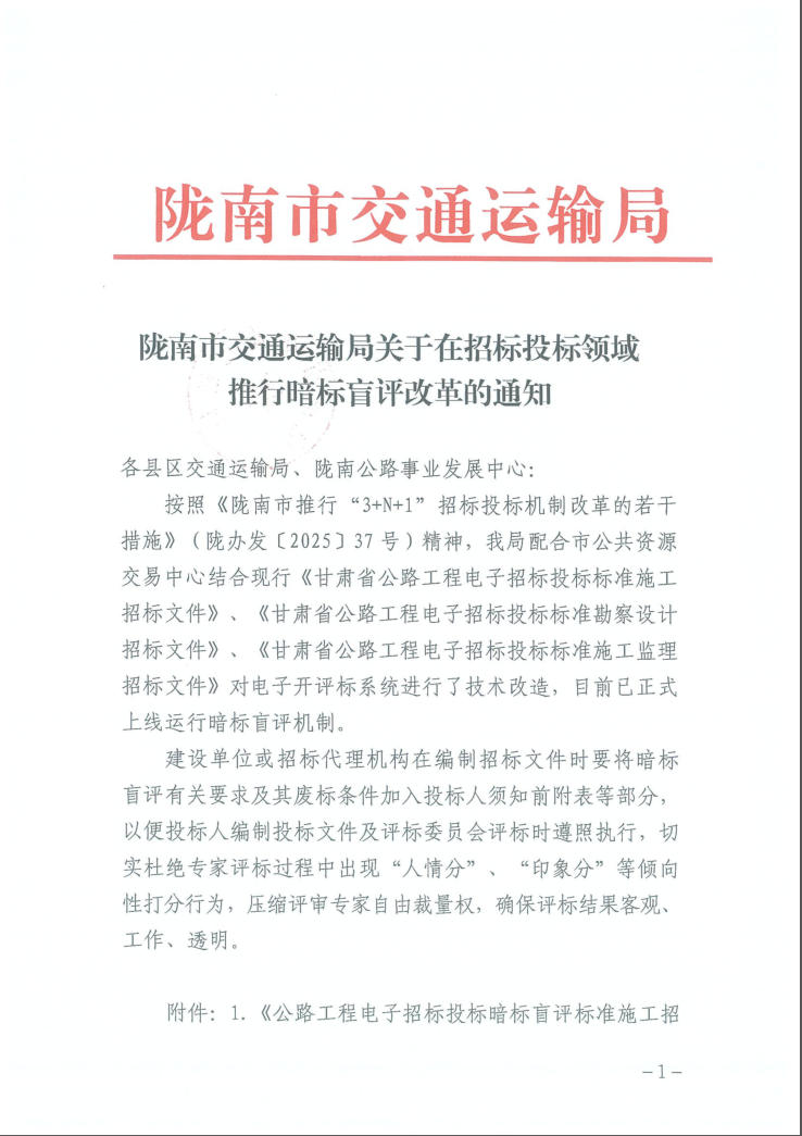 隴南市交通運(yùn)輸局關(guān)于在招標(biāo)投標(biāo)領(lǐng)域推行暗標(biāo)盲評改革的通知